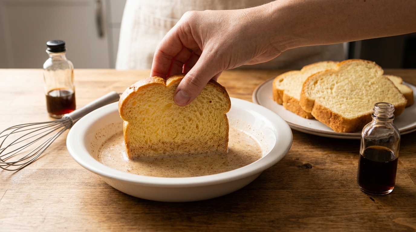 Dip each slice of bread into the mixture, ensuring both sides are evenly coated. Do not soak too long to avoid sogginess.